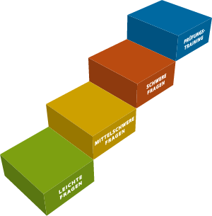 Das ist deine Erfolgstreppe zum Führerschein. Du startest mit den leichten Fragen und steigerst dich von Stufe zu Stufe. Wenn alle Fragen sitzen, wird es „ernst“ und es geht in die Prüfungssimulation.